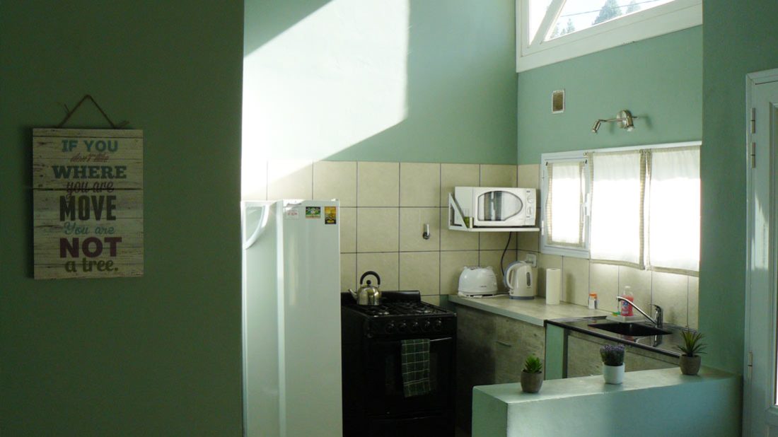 Cocina completa, gran heladera, tostadora, cubiertos y vajilla completos para 4/5 personas, luminosa con gran ventanal hacia los bosques de Villa Ayelén